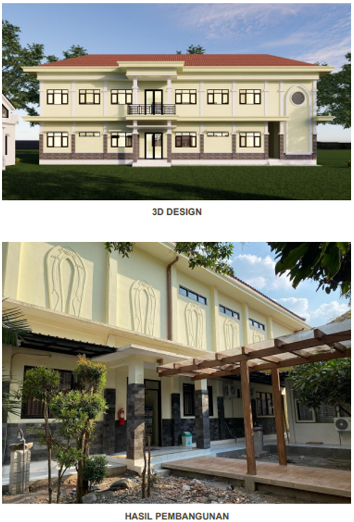 Proyek ini berupa pembuatan desain 3D Gedung Inspektorat Kabupaten Nganjuk, yang digunakan sebagai gambaran visual perencanaan bangunan sebelum tahap konstruksi dilaksanakan. Desain 3D menjadi media penting untuk memvisualisasikan bentuk bangunan, tata massa, fasad, dan proporsi ruang secara realistis. Deskripsi Proyek Pada proyek ini, siswa DPIB terlibat langsung dalam proses pemodelan bangunan gedung pemerintahan dua lantai, mulai dari analisis kebutuhan desain hingga visualisasi akhir dalam bentuk desain 3D. Berdasarkan gambar desain 3D yang ditampilkan, bangunan Gedung Inspektorat Kabupaten Nganjuk dirancang dengan karakter arsitektur formal dan representatif, sesuai dengan fungsi gedung sebagai institusi pemerintahan. Fasad bangunan menampilkan bentuk simetris dengan penekanan pada bagian tengah sebagai area entrance utama, dilengkapi kolom dan balkon yang memberi kesan kokoh dan berwibawa. Atap bangunan menggunakan model atap limasan dengan warna merah bata, yang mencerminkan identitas bangunan pemerintahan daerah. Elemen jendela tersusun rapi dan proporsional untuk mendukung pencahayaan alami serta sirkulasi udara. Pada desain juga ditambahkan detail ornamen dinding yang memperkuat estetika bangunan. Selain desain 3D, siswa juga mempelajari keterkaitan antara desain visual dengan kondisi nyata di lapangan. Hal ini terlihat dari kesesuaian desain 3D dengan hasil pembangunan, di mana bentuk massa bangunan, susunan lantai, kolom, dan fasad tetap mengikuti konsep awal perencanaan. Nilai Proyek Berdasarkan lingkup pekerjaan berupa pembuatan desain 3D bangunan gedung pemerintahan dua lantai, termasuk pemodelan fasad, tampilan perspektif, dan penyesuaian dengan standar bangunan publik, maka nilai proyek Teaching Factory ini adalah: Nilai Kontrak Proyek : Rp75.000.000,- (Tujuh Puluh Lima Juta Rupiah) Nilai tersebut mencerminkan: • Kompleksitas desain bangunan gedung pemerintahan • Luas bangunan dua lantai • Keterlibatan siswa dalam proses profesional berbasis industri • Fungsi desain sebagai media visualisasi perencanaan pembangunan